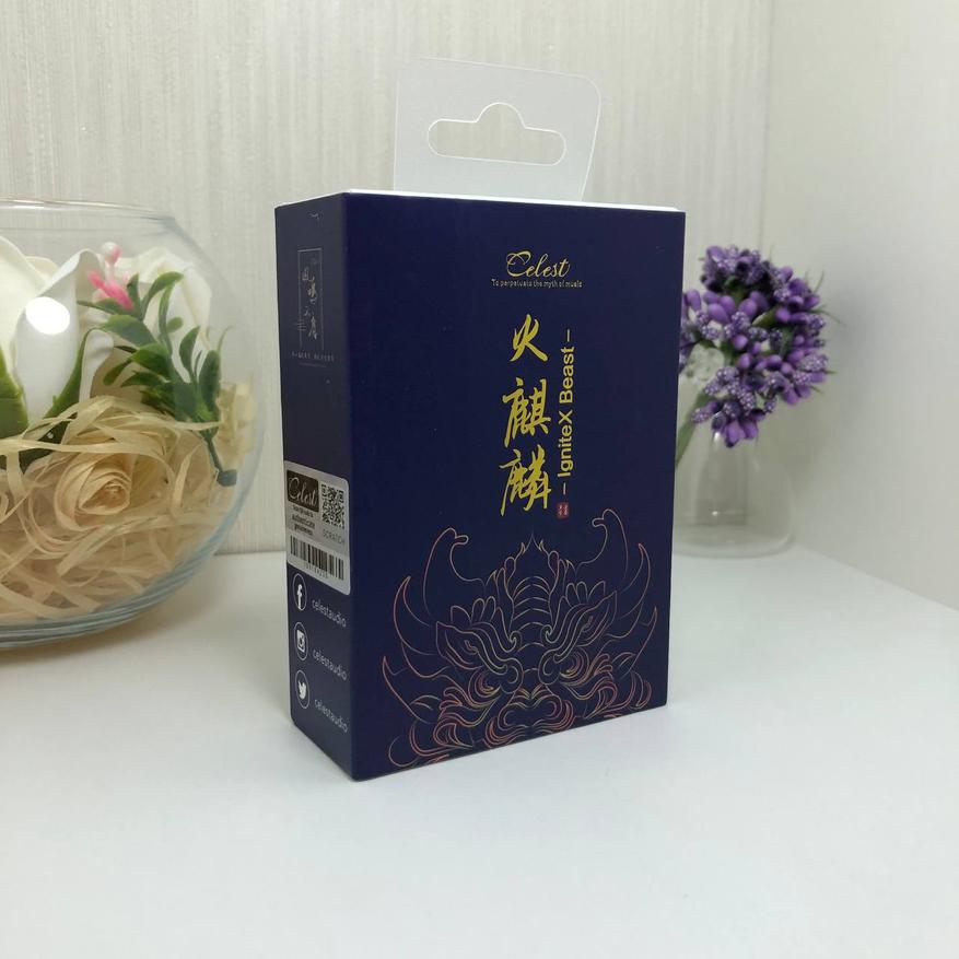Что ж, Целест умеет презентовать свой продукт, и эти ИЕМы не исключения. Celest IgniteX Beast поставляется в небольшой коробке синего цвета. На лицевой части нарисован зверь IgniteX, символизирующий эти ИЕМы, а так же, золотистым выгравировано IgniteX Beast и 3 китайских символа, а на задней части спецификация ИЕМов.