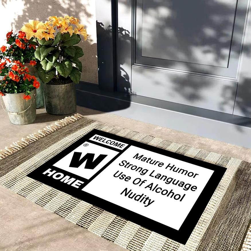 Первый коврик в списке — настоящая находка для геймеров. Его принт пародирует знаменитый значок рейтинговой системы ESRB (Entertainment Software Rating Board), которая оценивает содержание и устанавливает возрастной рейтинг для видеоигр. И, само собой, на нем красуется предупреждение о том, что за дверью вас ждут нагота, нецензурная лексика и шутки ниже пояса.