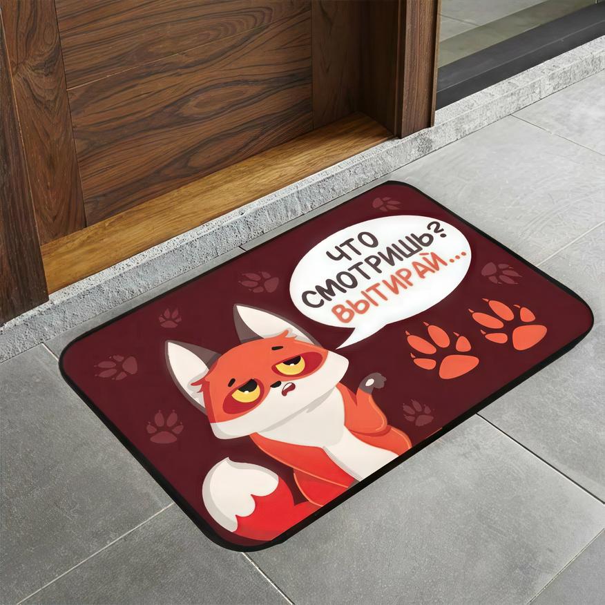 Любителям милых животных и тонкого юмора придётся по душе коврик с изображением весьма ехидной лисички. При первом взгляде на этот придверный коврик размером 40x60 см вы увидите очаровательную мордочку. Но стоит приглядеться, и вы заметите подпись, предлагающую не глазеть, а вытереть-таки ноги.