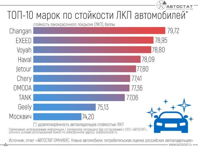Выше всего стойкость лакокрасочного покрытия своих авто оценивают владельцы моделей Changan, на втором и третьем местах — премиум-бренды Exeed и Voyah. В топ-5 вошли также Haval и Jetour.