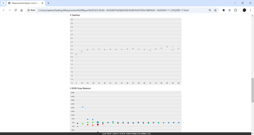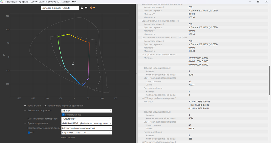 Гамма-коррекция экрана близка к стандартной 2.2, но некоторые отклонения в передачах красного и синего каналов указывают на ограниченность настройки профиля. Контрастность составляет около 1139:1, что для IPS-матрицы является приемлемым значением. Черный цвет выглядит достаточно глубоким, но в темных сценах может теряться детализация.