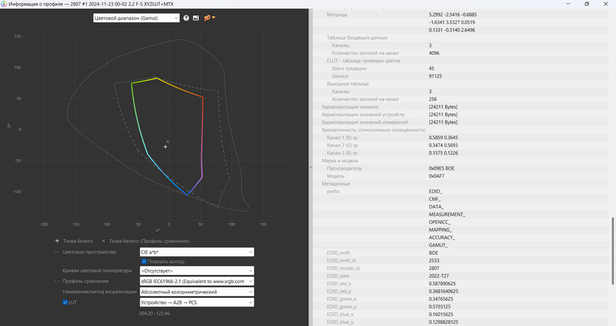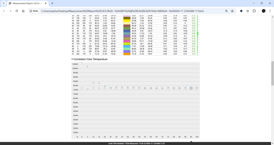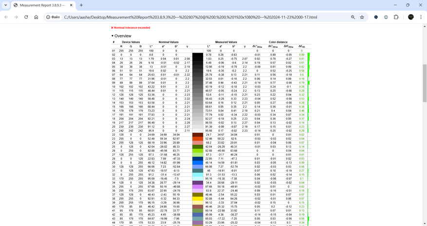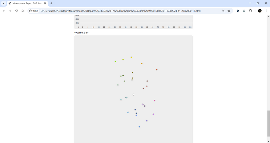 Визуализация тестовых цветов показала, что отклонение ΔE в среднем составляет 0.14, что неплохо для устройства этого класса, но максимальные значения до 4.7 указывают на необходимость калибровки. Это подтверждает, что экран способен отображать цвета без значительных искажений, но для более точной работы с графикой потребуется дополнительная настройка.