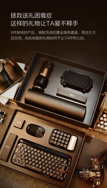 За указанную сумму покупатель получает набор из восьми предметов, среди которых — механическая клавиатура и мышь, мобильная колонка, светильник и калькулятор. Все изделия имеют единое оформление, построенное на сочетании черного и золотистого цветов.