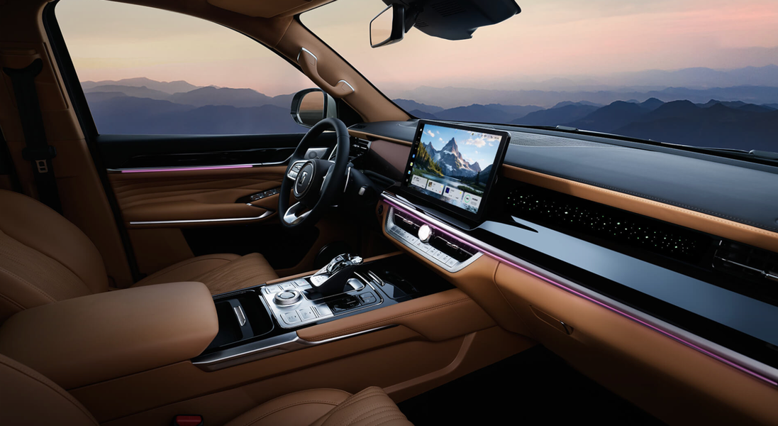 В комплектации машины — светодиодная светотехника, проекционный экран, медиасистема с экраном диагональю 14,6 дюйма, 7-дюймовый экран для задних пассажиров, трехзонный климат-контроль, адаптивный круиз-контроль, система кругового обзора, автоматический парковщик и другие функции помощи водителю.