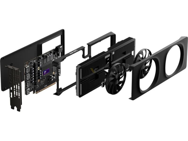 Arc B580 Limited Edition похожа на референсные карты прошлого поколения, но всё-таки со своими нюансами. К примеру, сзади тут большое прямоугольное окно в кожухе для вентиляции. Занимает адаптер всего два слота, но по длине она не самая короткая.