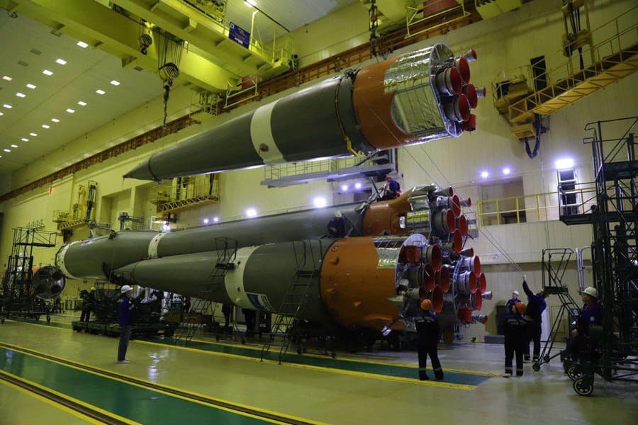 Операция по пристыковке четырёх боковых блоков первой ступени к центральному блоку второй ступени ракеты-носителя выполнялась в монтажно-испытательном корпусе 31-й площадки. Теперь специалисты продолжат подготовку ракеты-носителя и спутника.