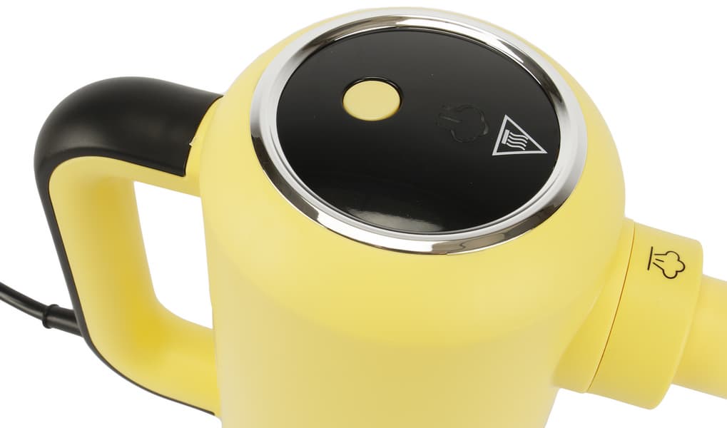 Желтая кнопка управления парогенератором находится сверху корпуса. Она выделяется на темном фоне, поэтому перепутать ее с чем-либо невозможно. Рядом изображена пиктограмма, предупреждающая о необходимости соблюдать осторожность, и индикатор пара.