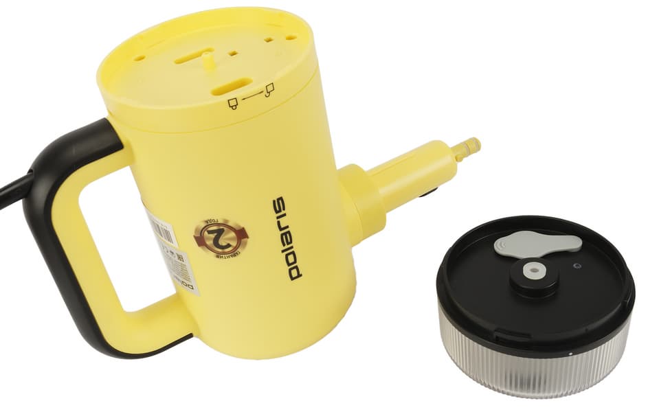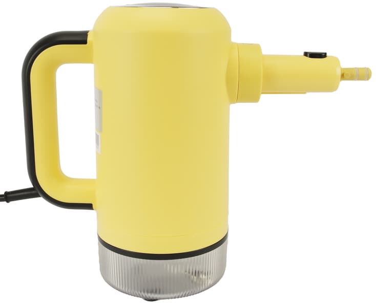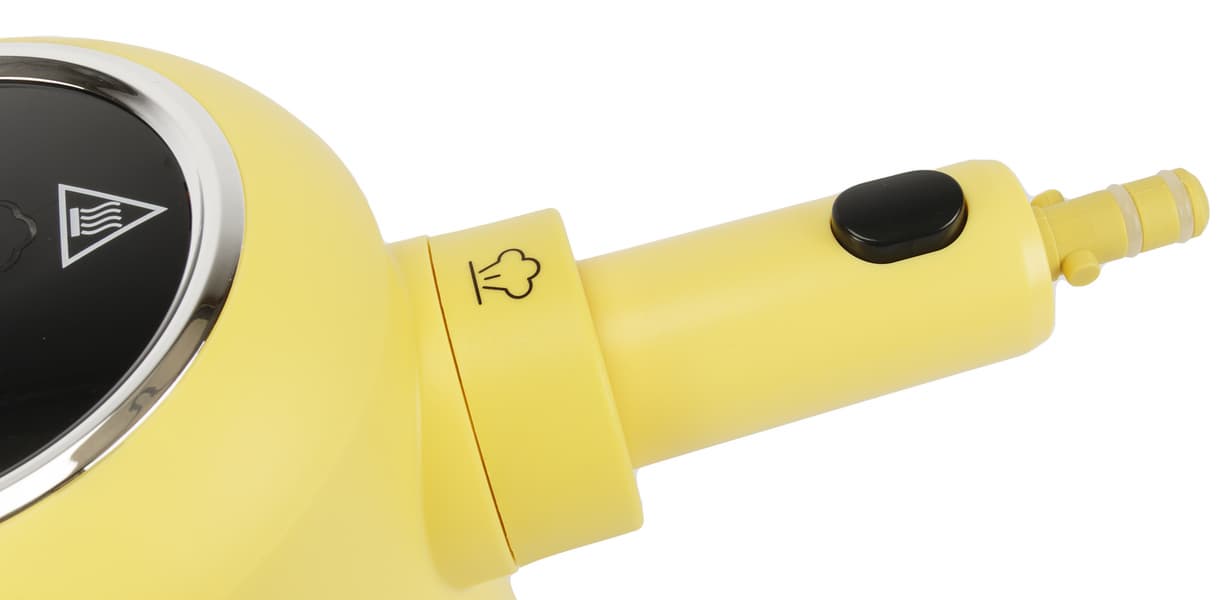 Корпус устройства выполнен в основном из из желтого пластика, но имеет и несколько черных вставок, кнопок и круглый черный дисплей сверху. У прибора простая и понятная конструкция: пароочиститель состоит из моторного блока с ручкой и рабочей части — сопла.