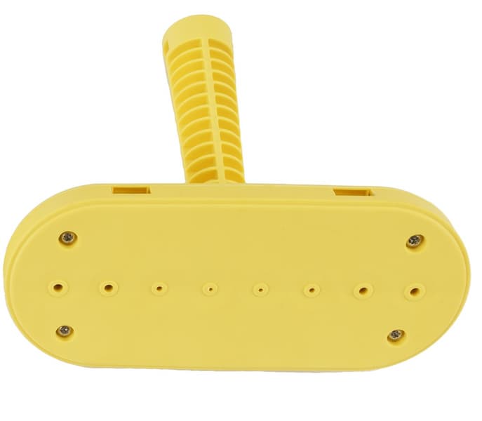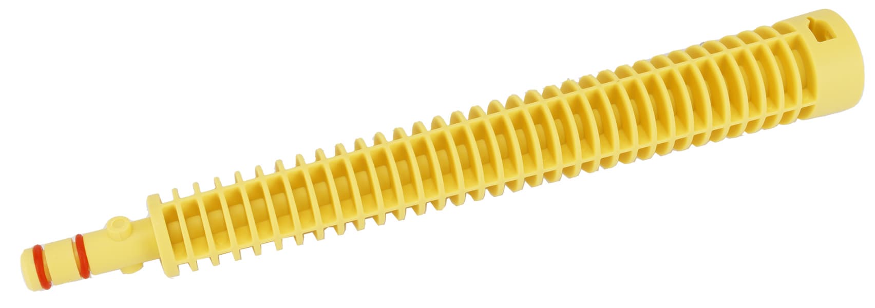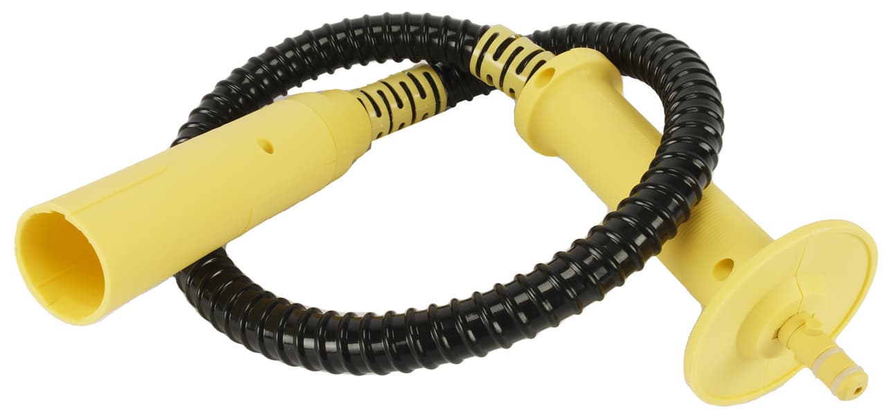 Сопло-удлинитель представляет собой ребристую желтую пластиковую трубку, с широкой стороны у которой находится разъем для крупного штыря, то есть ее можно закрепить прямиком на сопло моторного блока, либо на удлинительный шланг. С узкой стороны мы видим узкий штырек с двумя красными резиновыми кольцами — значит на него можно устанавливать насадки с узким разъемом.