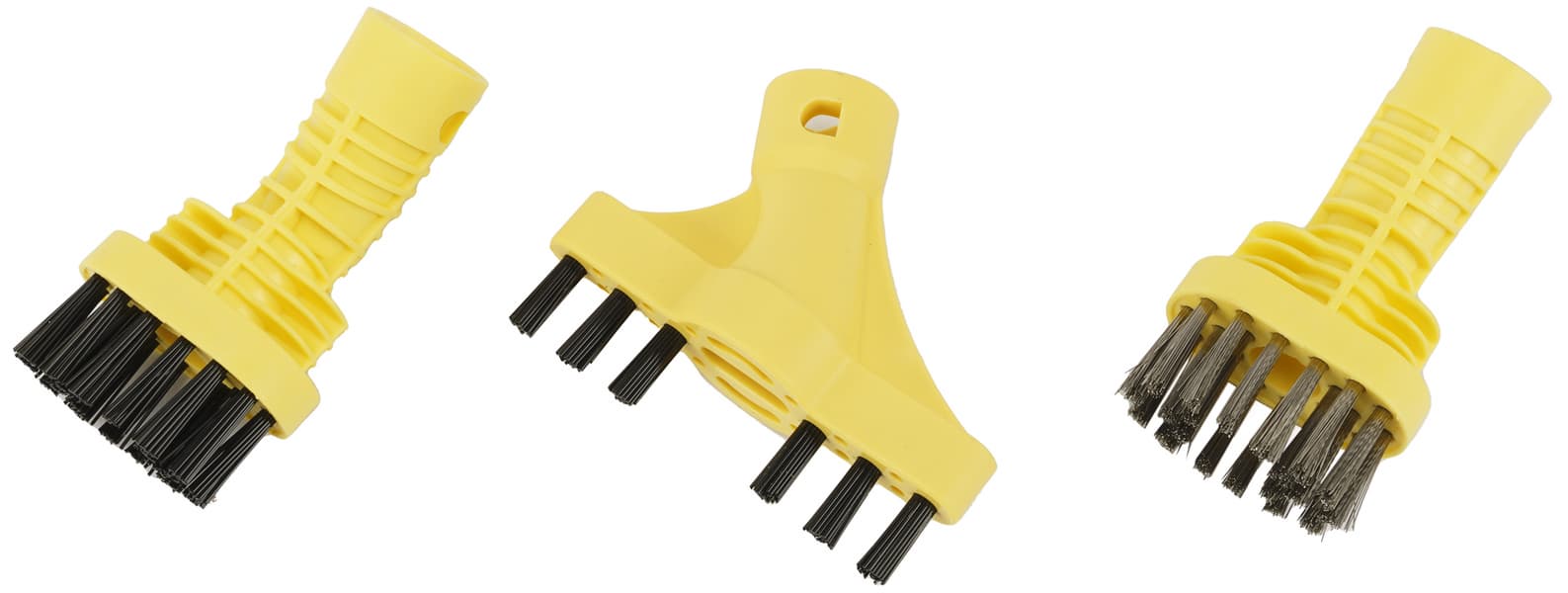 - насадки: скребок для сильных загрязнений, изогнутое сопло, щетка из нержавеющей стали, нейлоновая щетка, круглая щетка-губка, широкая нейлоновая щетка