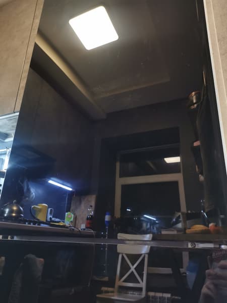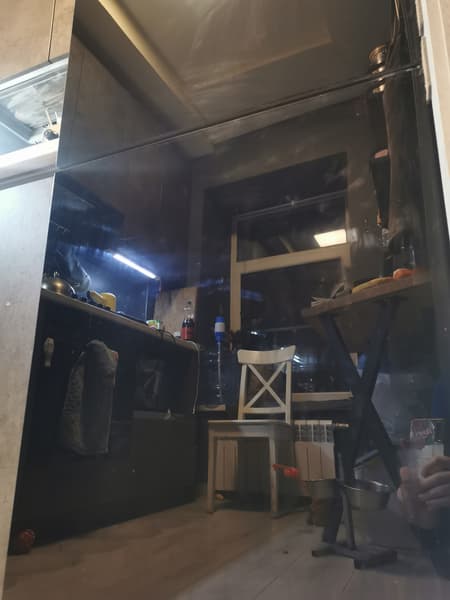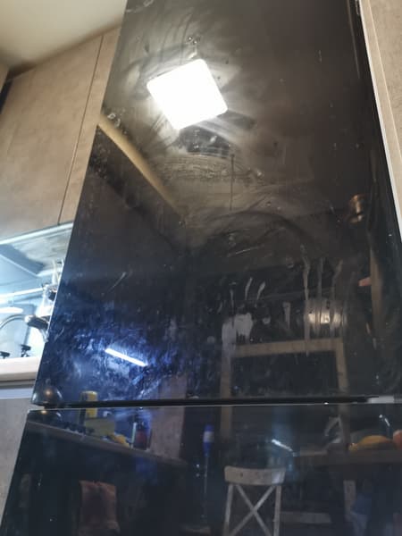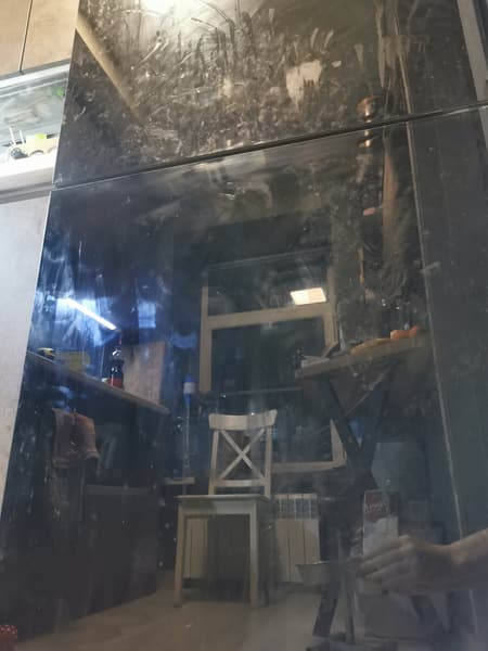 После окна мы планировали почистить еще и зеркало, но вспомнили, что у нас есть более подходящий кандидат на кухне: черный стеклянный холодильник, собирающий всю грязь с огромным удовольствием и невероятной скоростью.