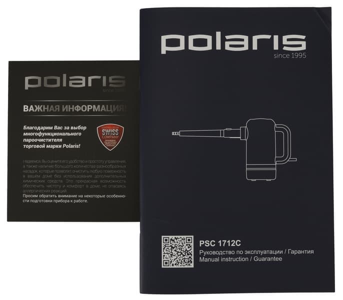 В комплект документации к пароочистителю Polaris PSC 1712C входят руководство по эксплуатации и гарантийный талон.