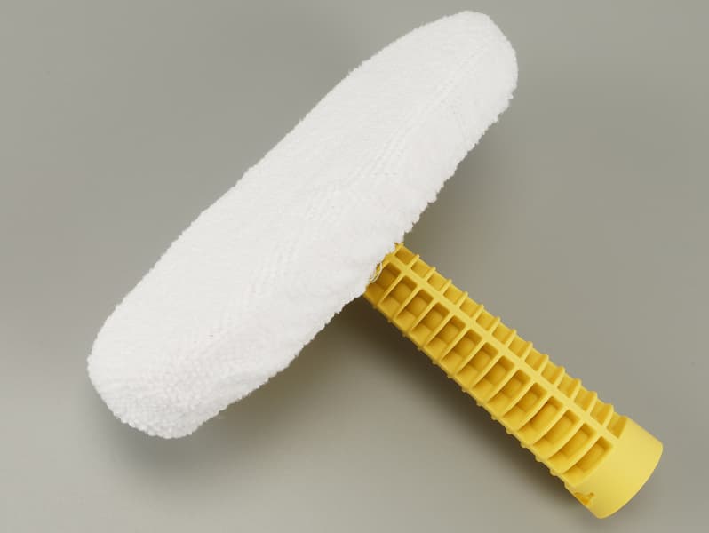 На нее можно надеть белую салфетку-тканевый чехол и использовать прибор для очистки мягкой мебели, штор, другого текстиля и отпаривания одежды, либо закрепить насадку с черным резиновым скребком для очистки стекол и зеркал.