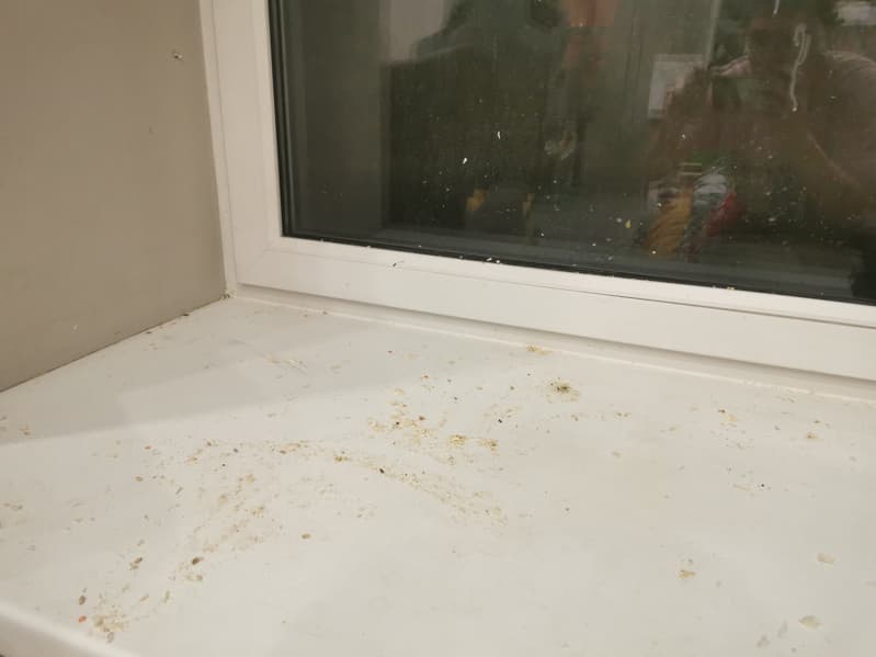 Как можно видеть на фотографии, древесные опилки голубь категорически не одобряет, поэтому мы имеем подоконник в весьма неприглядном виде.