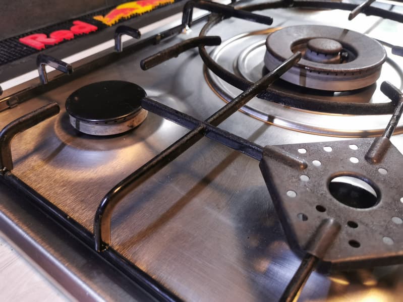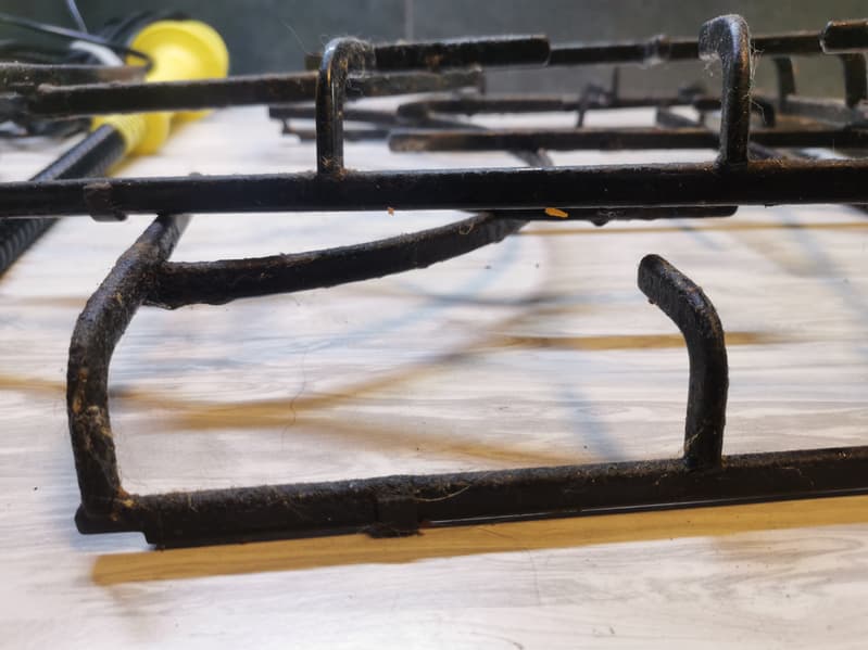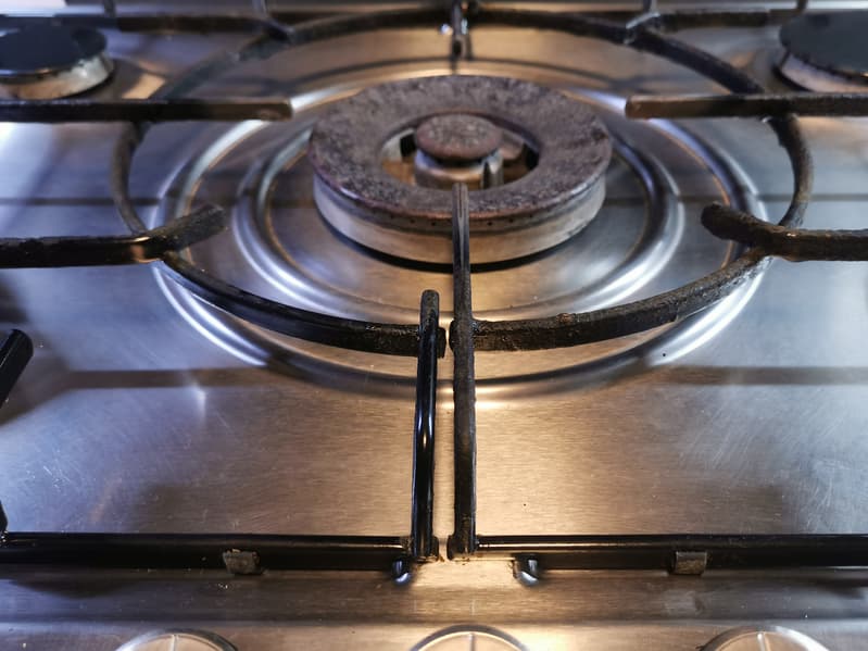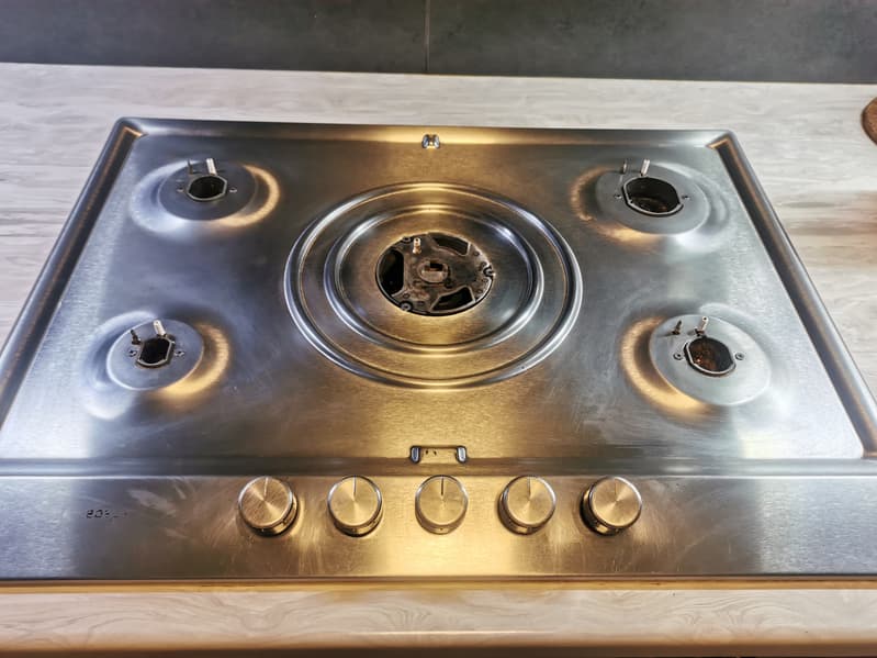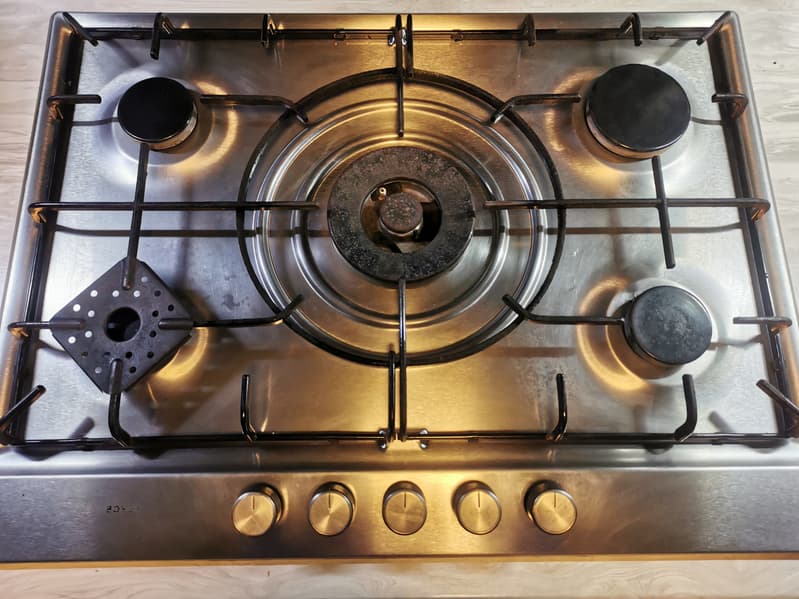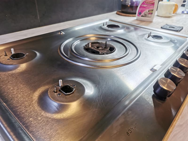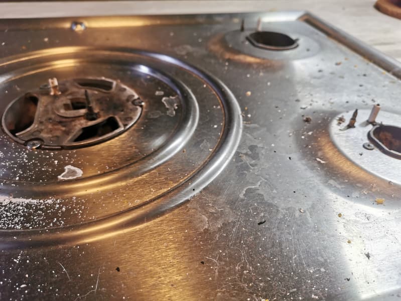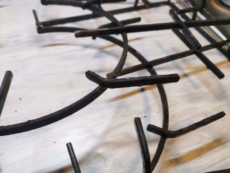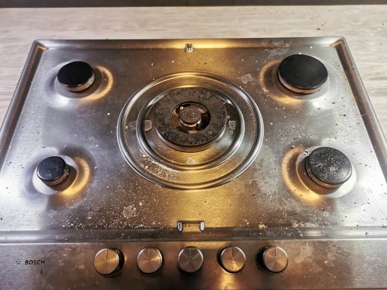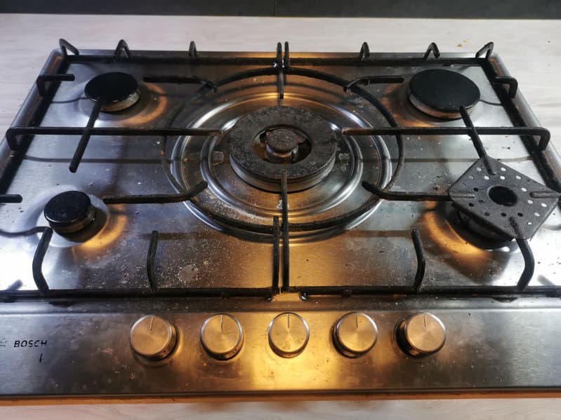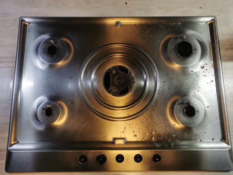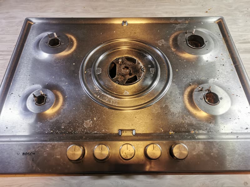 Далее мы приступили к газовой варочной поверхности с 5 конфорками, 2 металлическими решетками, 1 металлической подставкой и множеством следов эксплуатации.