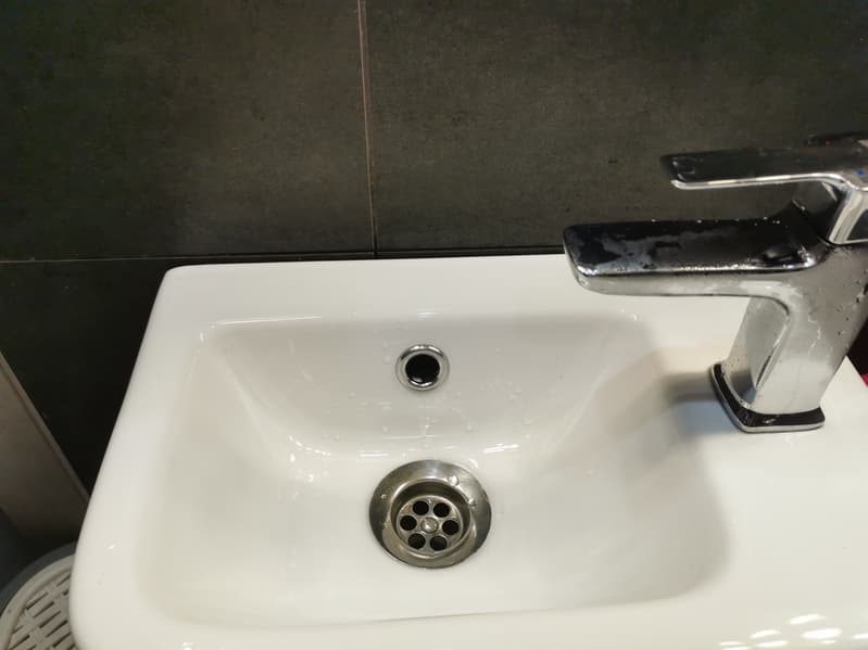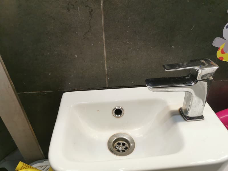 Сначала мы взялись за чистку раковины, смесителя и кафеля над ними.
