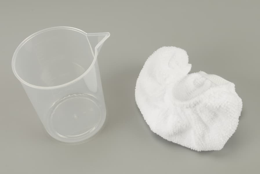 В комплекте к прибору поставляется прозрачный пластиковый мерный стаканчик с нанесенной объемной градуировкой от 10 до 100 мл и удобным узким носиком для залива воды в резервуар. Также на фото показываем, как выглядит тканевый чехол для мини-швабры.