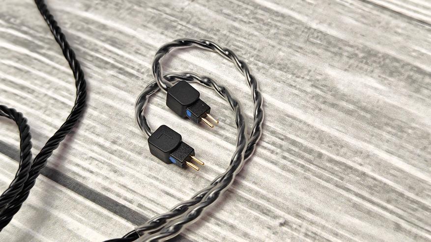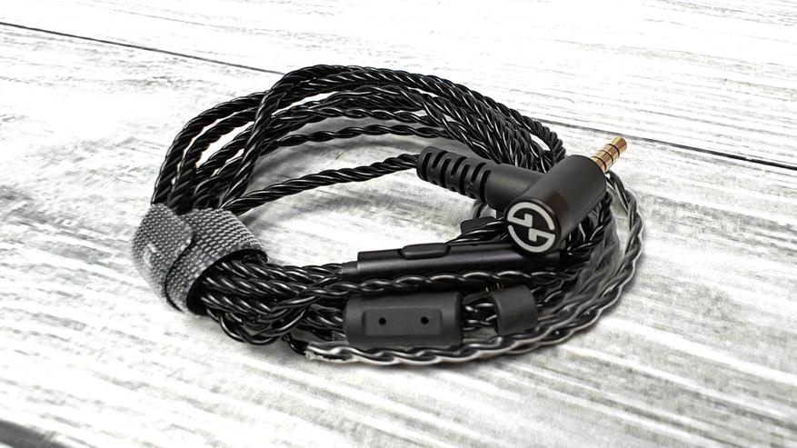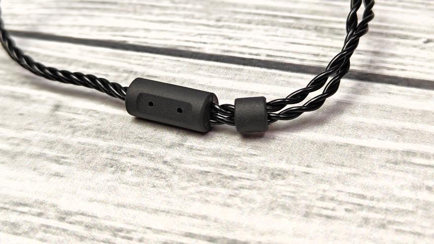 Кабель с проверенным уже двухпиновым разъемом. Внутри кабеля медный 4-жильный провод. Миниджек угловой с позолотой. Место входа кабеля защищено резиновой втулкой. Кабель оборудован именной велкро-стяжкой. Как мы можем видеть — это модель представляет собой гарнитуру с микрофоном. На корпусе микрофона расположена кнопка для ответа на звонок и отверстие. Разделитель резиновый с втулкой ограничителем. Кабель на конце имеет заданный изгиб при помощи плотной прозрачной силиконовой втулки. Разъемы плотные, вставляются в наушники с заметным усилием, случайно сами по себе не выпадут.