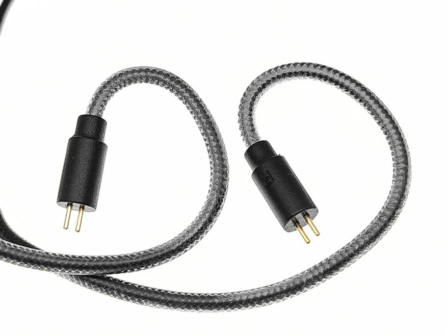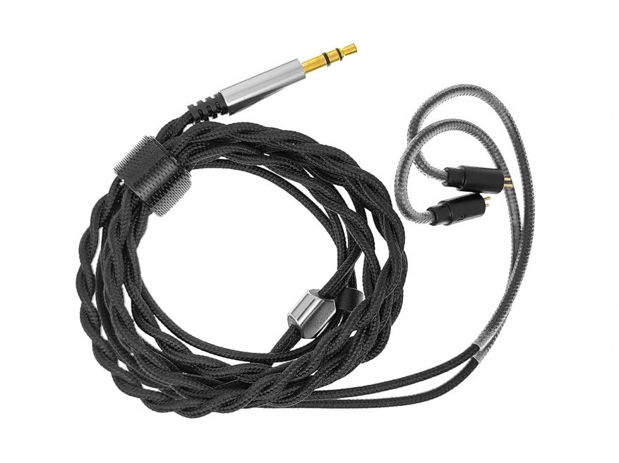 Кабель довольно тонкий, лёгкий, с хорошей гибкостью и мало склонный к спутыванию. До разветвитель он витой двухжильный, а выше одножильный. Коннекторы стандартные двухпиновые, без пенька и с буквенной маркировкой каналов. Присутствуют заушины, а так же имеется легко скользящий слайдер для стягивания верхних проводов. Штекер прямой, 3.5 миллиметровый. На фотографиях производителя наушники Rose Aurora Ultra изображены с кабелем у которого штекер угловой и есть микрофон. Так что возможно вскоре в продаже появится версия такой вариант комплектации.