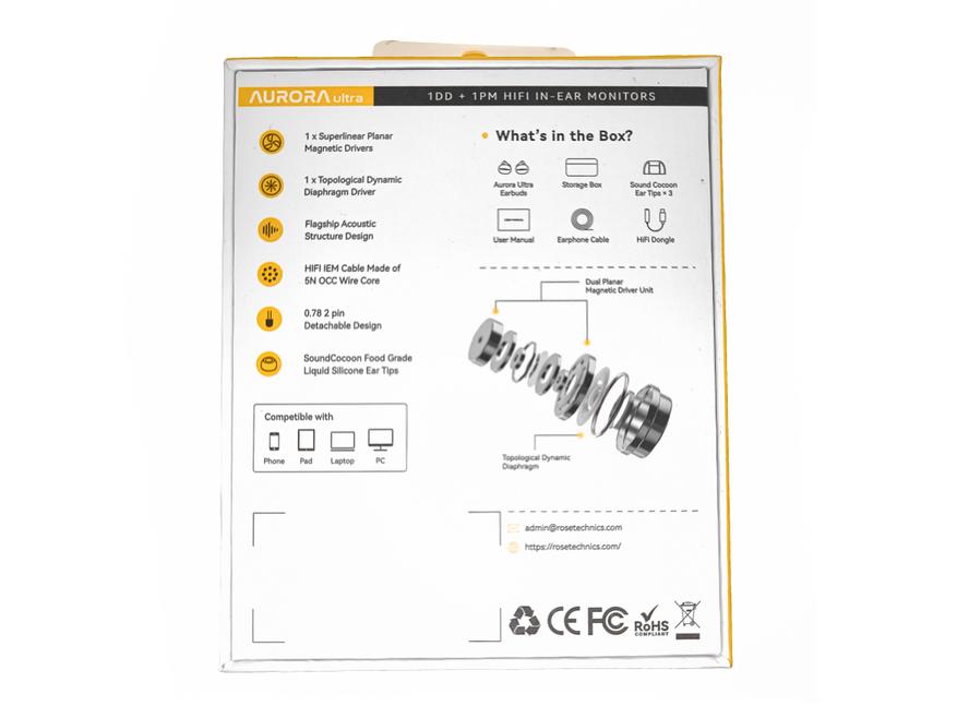 Наушники Rose Aurora Ultra поставляются в небольшой коробке из плотного картона, на которой напечатана различная полезная информация: изображение и название наушников, описание их особенностей, перечень товаров входящих в комплект поставки, схематическое изображение драйверов, а так же характеристики наушников и контактные данные производителя.