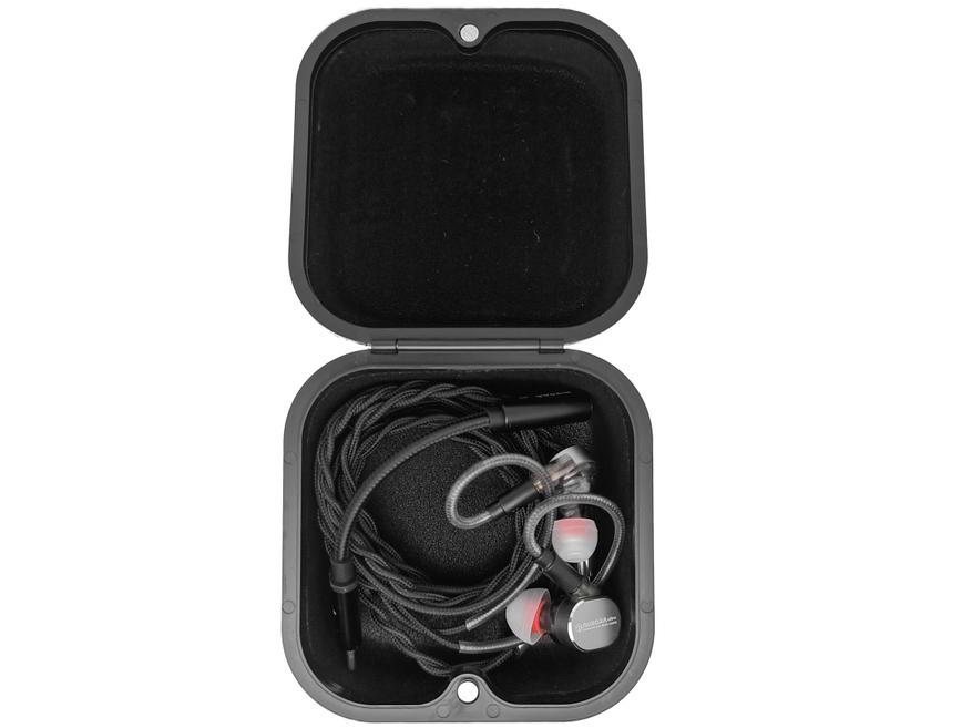 Комплектный жёсткий футляр для наушников шикарный — наверное один из лучших, что я когда-либо встречал. Он шикарный не в визуальном плане (там нет натуральной кожи, закоса под модный аксессуар или необычного дизайнерского решения), а в практичном. Футляр прочный, герметичный, вместительный, запирается на магнит, и внутри покрыт мягким пористым материалом. Внутрь футляра помещаются большие наушники с очень толстым проводом + маленький ЦАП, или же наушники с тонким проводом + большой ЦАП (например Cayin RU6). Внешние размеры футляра: 87х87х41 mm, а внутренние: 79х79х36 mm.