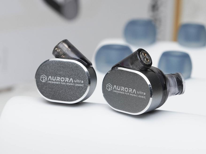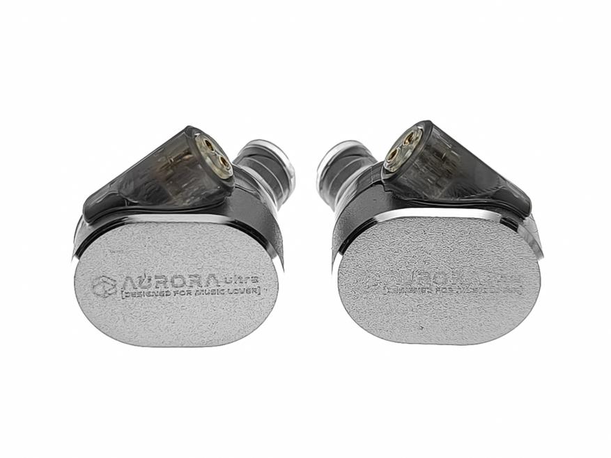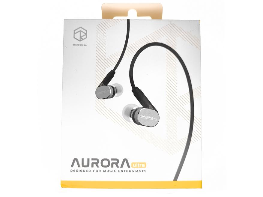 Rose Aurora Ultra изготовлены из двух различных материалов: прозрачного пластика и алюминия. Та часть, которая касается тела пластиковая, а внешняя сторона наушников металлическая. Звуководы овальные, диаметром 5.7-6.2 mm. Защитная сетка текстильная. Возле звуководов находятся компенсационные отверстия. Сверху наушников, под большим углом расположены двухпиновые разъёмы.
