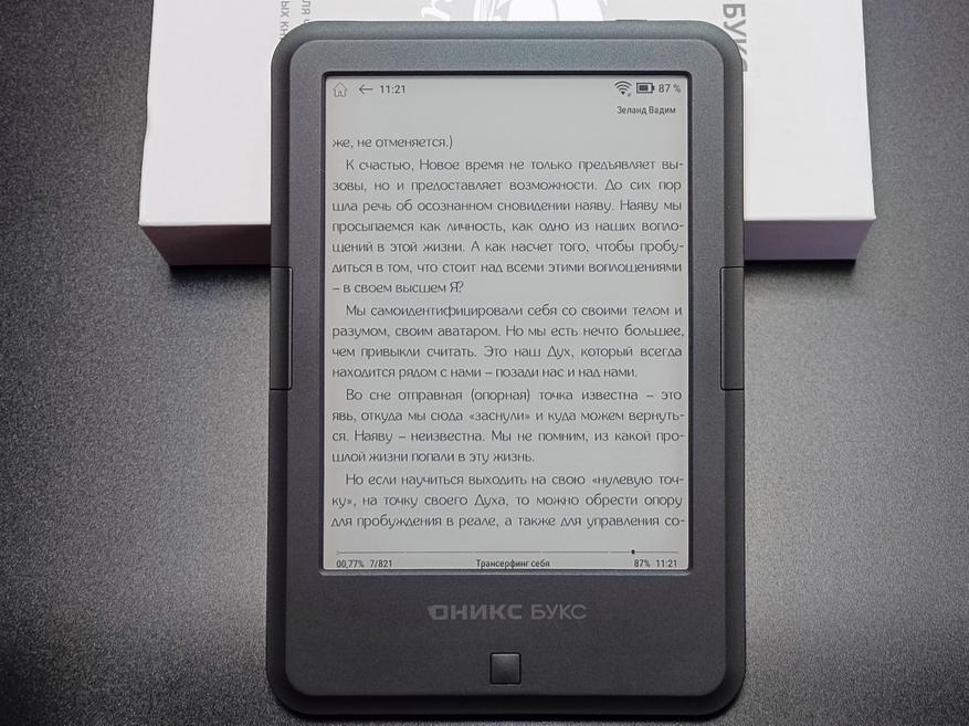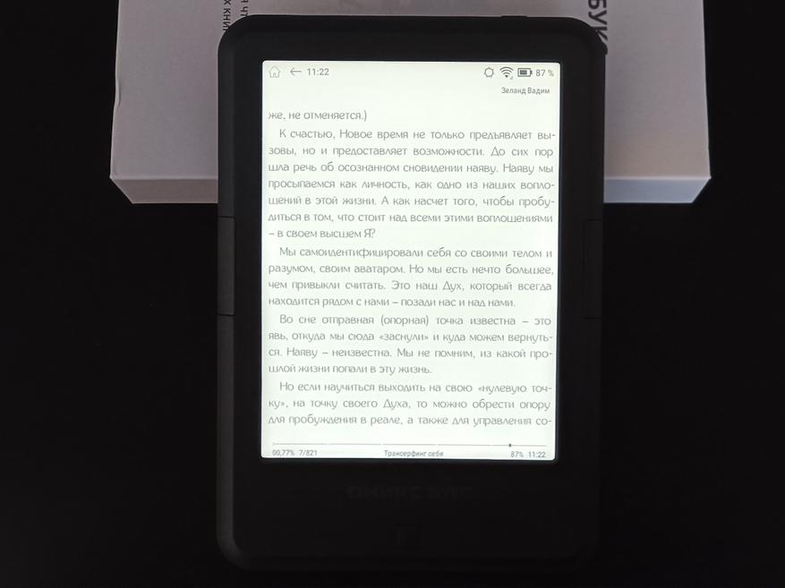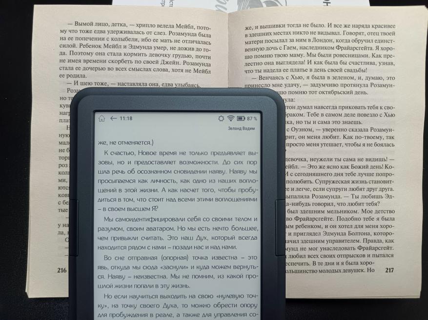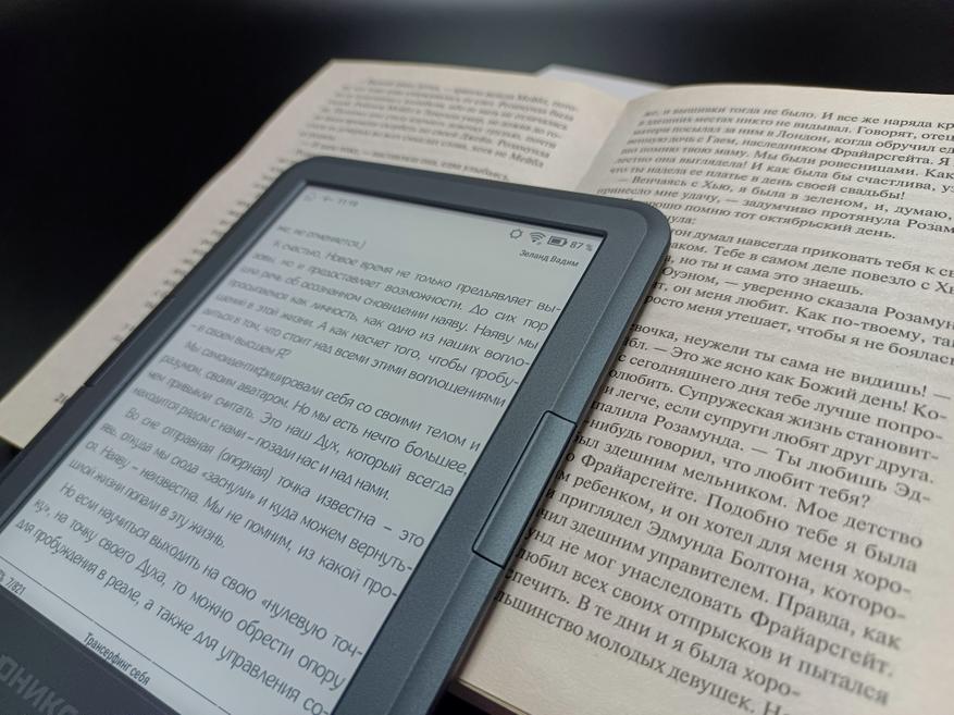 Для сравнения, ниже приведено изображение текста на экране ридера на фоне примерно аналогичной по размеру шрифта страницы книги. Как видно, даже при выключенной подсветке, экран устройства читается значительно лучше книжного листа, при этом нисколько не уступая ему по углам обзора.