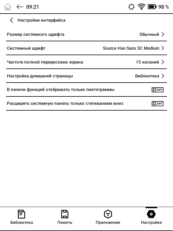 Работать с крупными элементами на небольшом черно-белом экране довольно комфортно, кроме того здесь предусмотрено огромное количество различных настроек, с помощью которых ридер можно довольно быстро настроить «под себя»