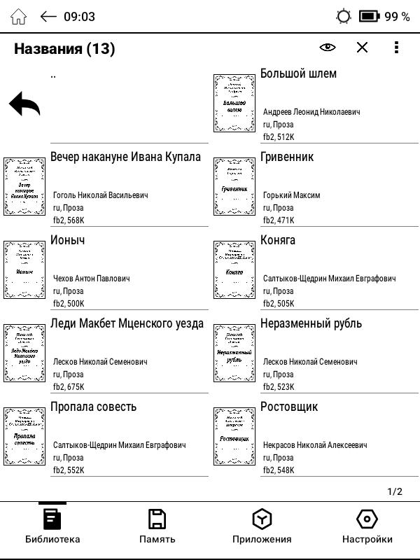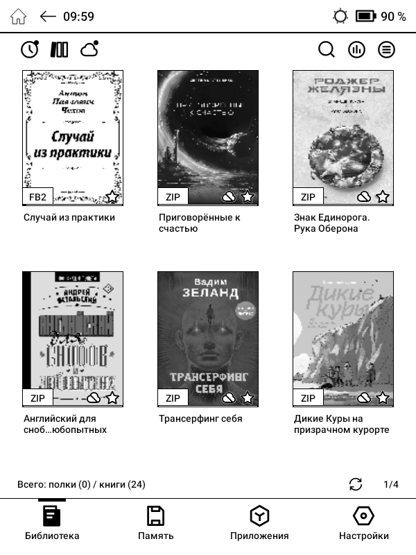 По умолчанию, после включения устройства мы попадаем в электронную библиотеку, которая может автоматически сортировать книги по авторам, названиям и сериям. Есть удобный поиск и фильтры для быстрого поиска нужных книг по жанру, языку, дате публикации и т. д. Кроме того, поддерживаются стандартные папки, созданные на настольном компьютере. Также есть различные удобные «фишки», например, если ридер был выключен во время чтения, то незакрытое произведение на нужной странице сразу же появится на экране. Впрочем, поведение после включения также можно изменить в настройках.