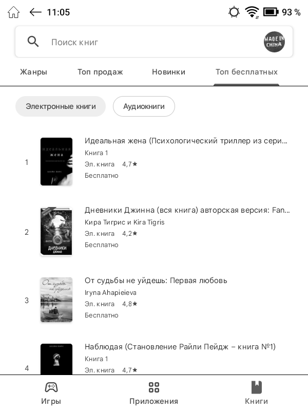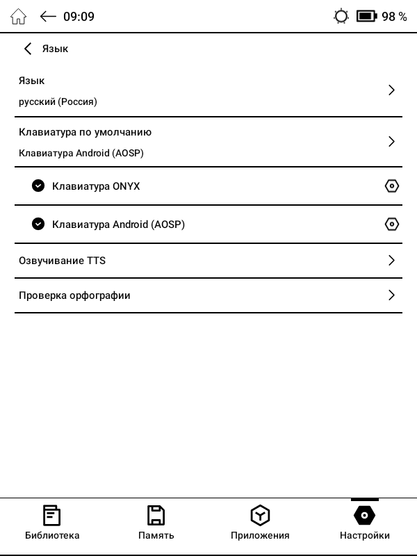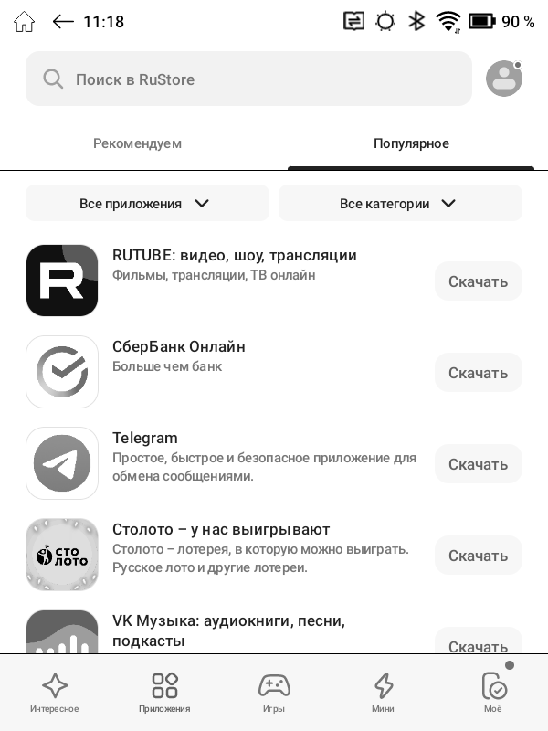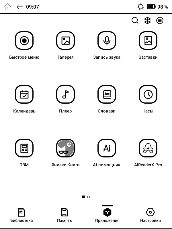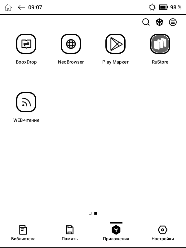 Помимо «читалок», в стоковый перечень приложений ОНИКС БУКС Беринг 5 входят веб-браузер, аудиоплеер, диктофон, календарь, онлайн библиотека Яндекс Книги. Для установки дополнительных приложений можно воспользоваться предустановленными здесь магазинами RuStore и Google Play, в каталоге которых представлены десятки тысяч различных программ, либо самостоятельно установить любое нужное приложение в виде .apk-файла, скачав его из Сети.