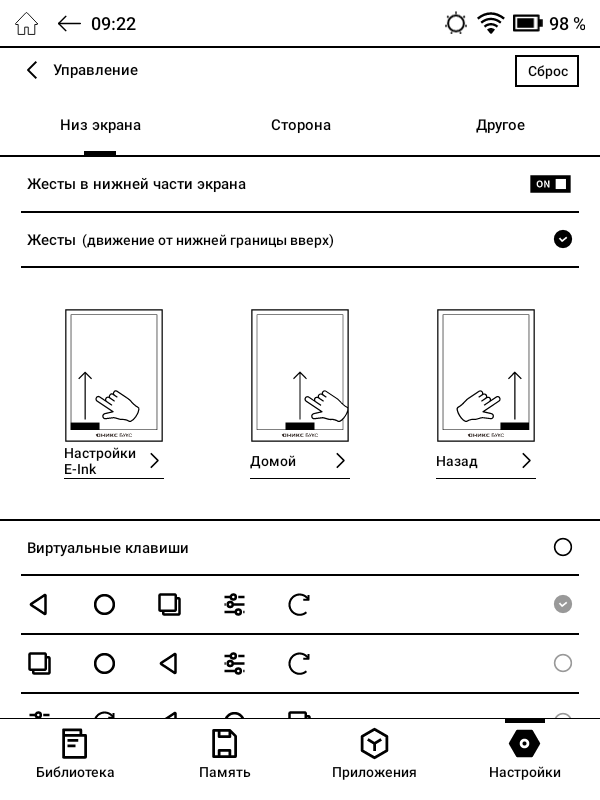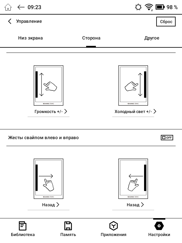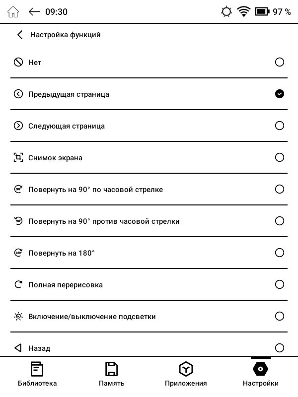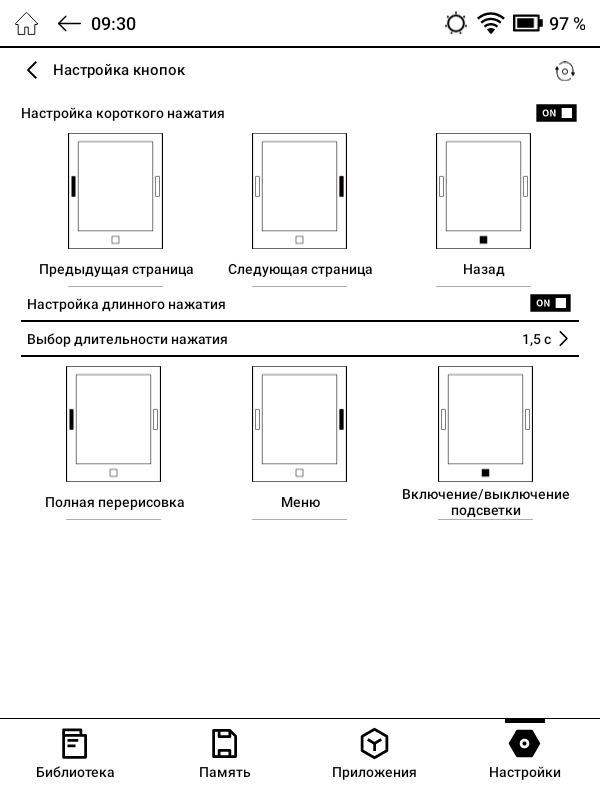 На боковых гранях корпуса находятся кнопки, при помощи которых можно пролистывать электронные страницы при чтении или регулировать громкость при прослушивании аудио. Через специальный раздел настроек можно переопределить функции как для этих, так и для других физических кнопок ридера.