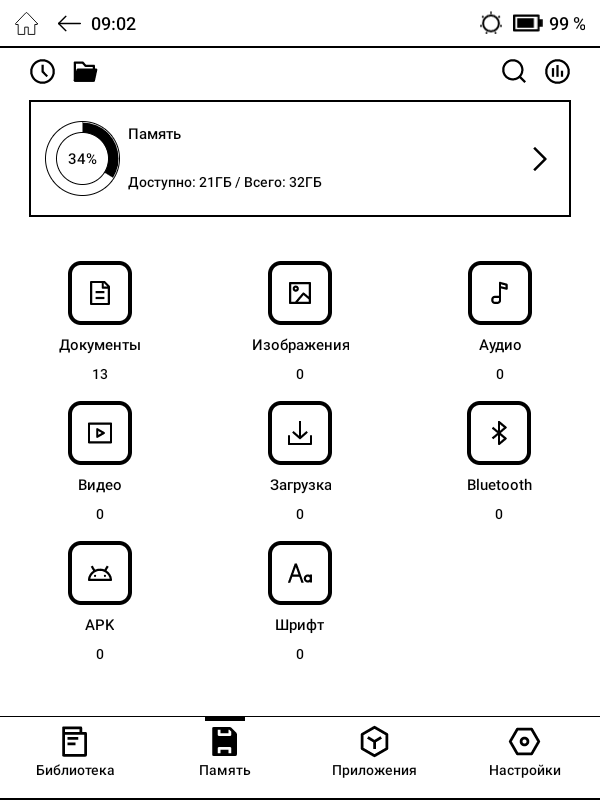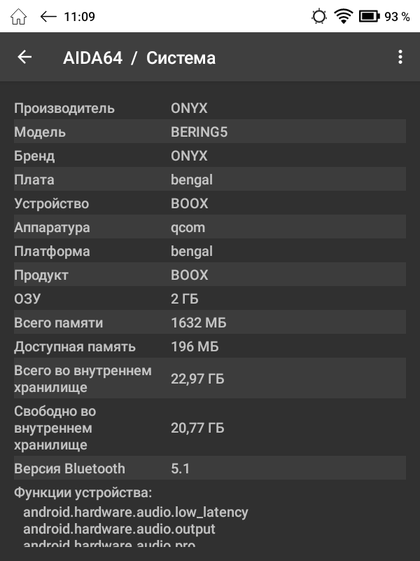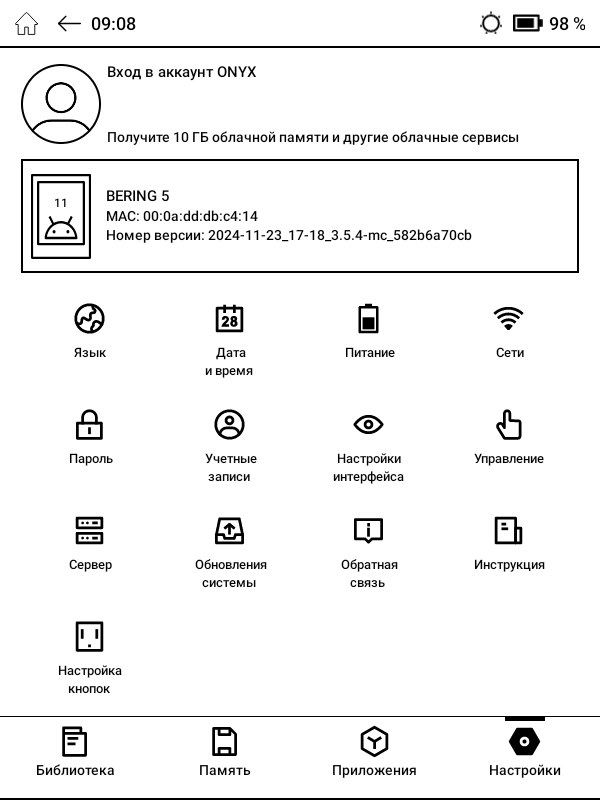 ОНИКС БУКС Беринг 5 работает под управлением операционной системы Android 11 с фирменной оболочкой, адаптированной под особенности электронных книг.