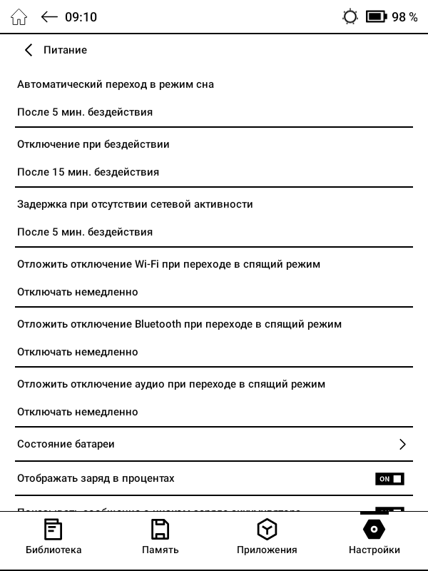 В автоматическом режиме перелистывания страниц, при отключенной подсветке экрана и с выключенными WiFi и Bluetooth за 18 часов работы ОНИКС БУКС Беринг 5 потратил всего 8% заряда (примерно 0,5% в час), то есть в пересчете мы получим около 9 дней круглосуточной работы. Само собой, что при использовании подсветки и беспроводных интерфейсов энергопотребление заметно увеличится, но этот пример я думаю будет наиболее показательным.
