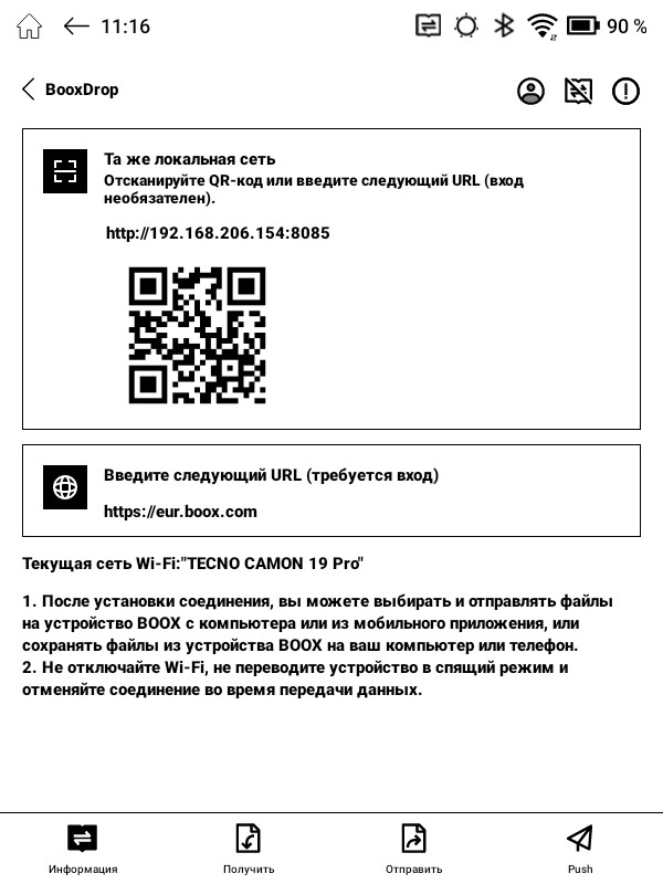 Так, например, подключив устройство и смартфон/компьютер к одной WiFi-сети, после запуска в ридере приложения BooxDrop мы узнаем в нем специальный IP-адрес. Далее, перейдя на этот адрес с нашего смартфона или компьютера через браузер мы получим возможность работать с файлами во внутренней памяти ридера в режиме копирования и пересылки.