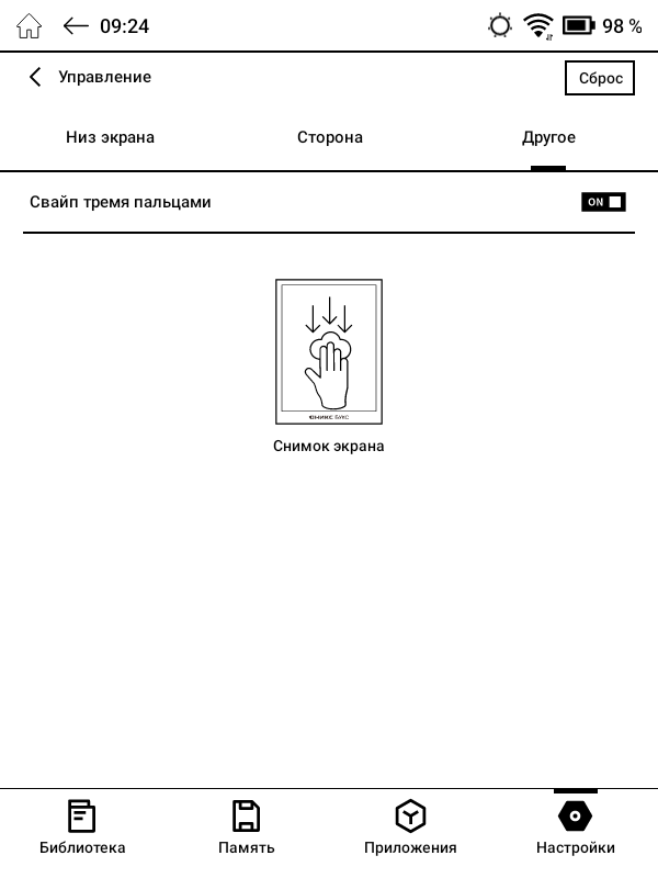 Так как в ОНИКС БУКС Беринг 5 нет встроенного G-сенсора, здесь не предусмотрена автоматическая смена ориентации экрана при повороте ридера, но сделать это можно самостоятельно воспользовавшись специальной кнопкой в том же верхнем меню.