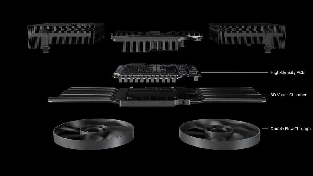 На изображении можно видеть, что конструкция новинки включает шесть тепловых трубок, огромную испарительную камеру, три отдельных секции радиатора, а вот печатная плата при этом невероятно компактна с очень плотным размещением компонентов.