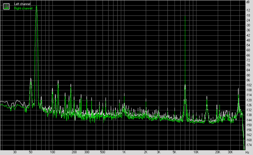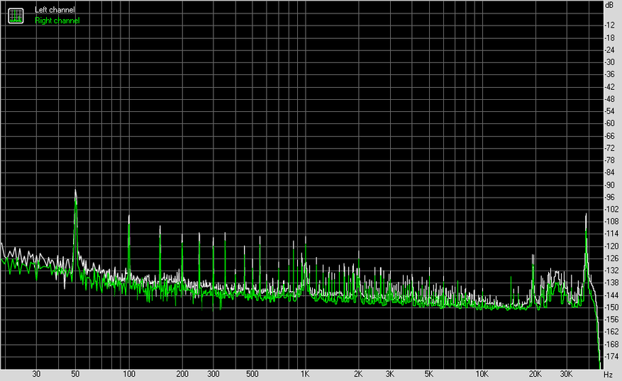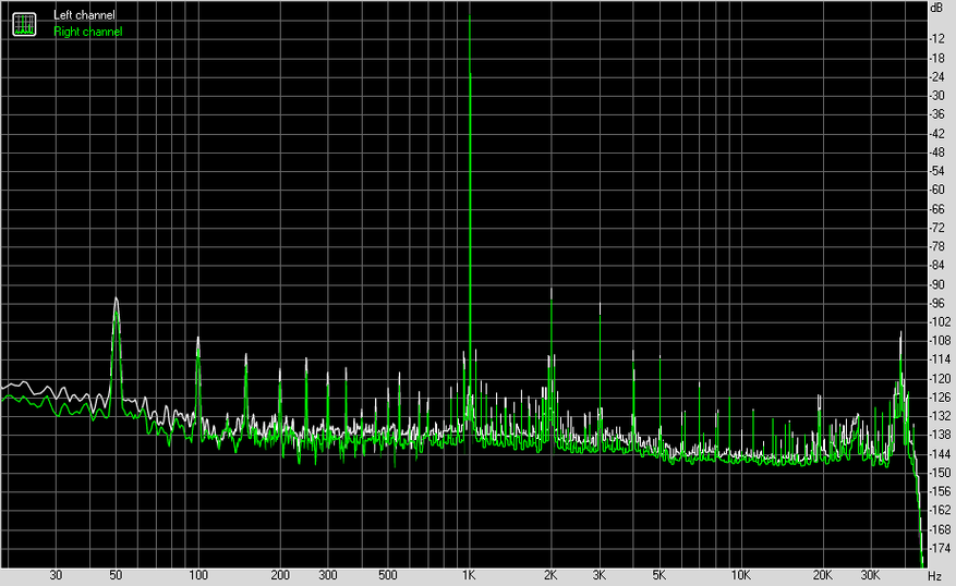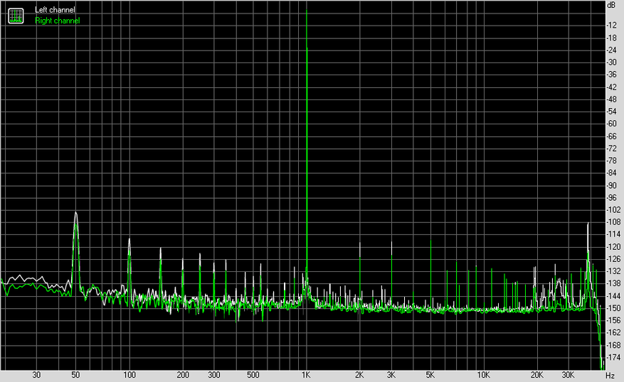 В любом случае, у нас почти отсутствующий уровень собственных шумов, прекрасный динамический диапазон и искажения, составляющие минус 116 дБ сразу для гармонических и интермодуляционных. Кстати, обратите внимание на две первых гармоники после основного тона, такое вполне могли сделать намеренно, чтобы, так сказать, облагородить звучание.