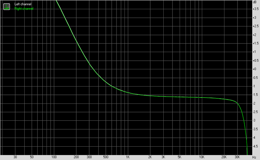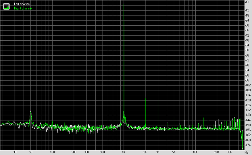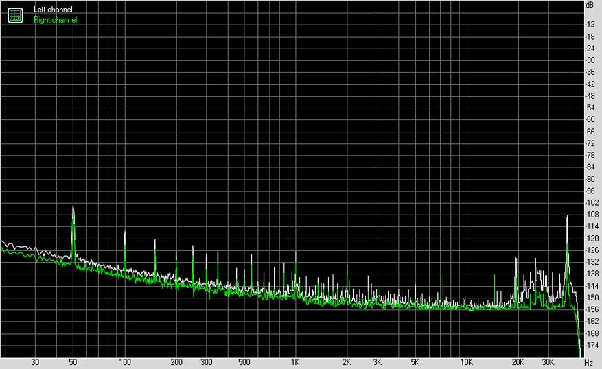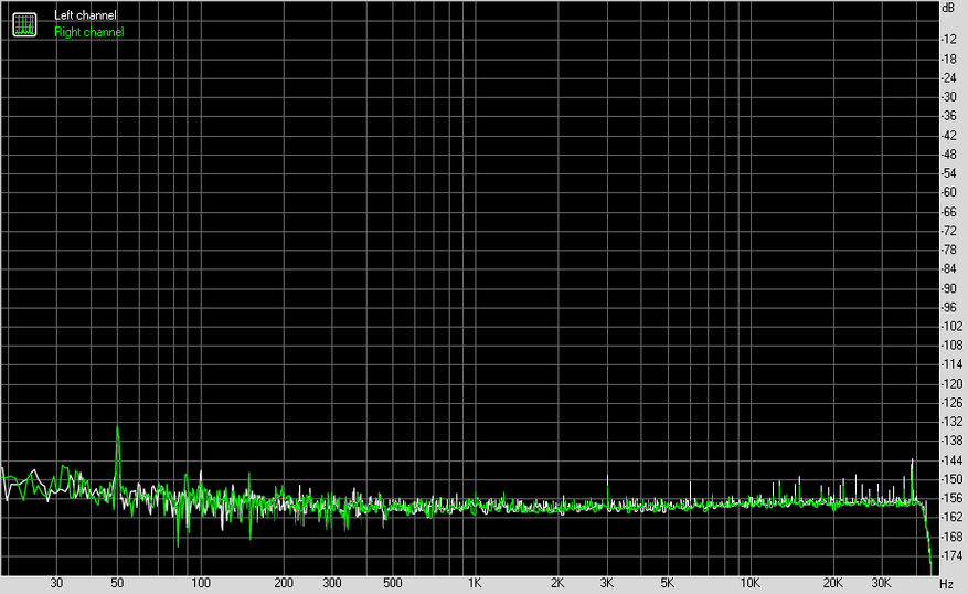 Замеры я проводил в 24 бита 96 кГц с каждого из выходов на АЦП E1DA Cosmos. В результате, RCA показал себя просто великолепно, за исключением нелинейности АЧХ, где можно видеть легкий спад на низких частотах.