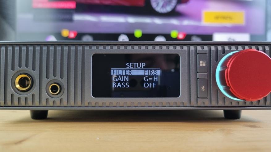 Регулятор имеет приятный чуть тугой ход. Вращая его мы настраиваем уровень сигнала, нажатие же переключает входы или меняет значение в меню. Для блютуз нам вывели отдельную кнопку, ну, а вторая — переносит нас в системное меню, где можно выбрать один из 8 цифровых фильтров, уровень усиления для наушников и буст низких частот. Последнее меня немного смущает, хотя, если рассматривать это, как на эффект, то почем нет.