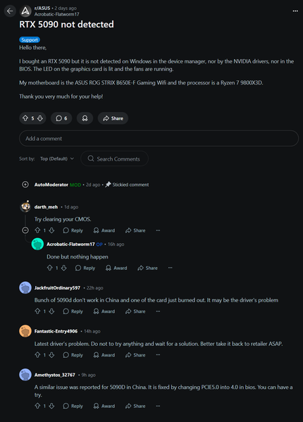 В США один из пользователей форума Reddit (владелец GeForce RTX 5090 от Asus) сообщил о такой же проблеме — ускоритель перестал распознаваться Windows и BIOS. Обнуление BIOS видеокарты не дало никакого результата.