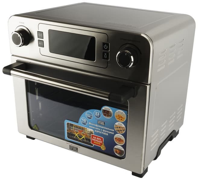 Удачная модель многофункциональной переносной конвекционной духовки с диапазоном температур 40—230 °C и десятью автоматическими программами удивила нас качественной работой и поистине широкой функциональностью. Ведь низкотемпературные режимы в сочетании с таймером на 5 часов можно использовать для ферментирования, приготовления йогурта, сушки, расстойки теста и медленного приготовления. Основное достоинство духовки — возможность готовить в ней и как в классическом духовом шкафу, и как в аэрогриле, и как в шашлычнице (есть вертел). А еще в комплект входит камень для пиццы, корзина для аэрофритюра и есть встроенный гриль!