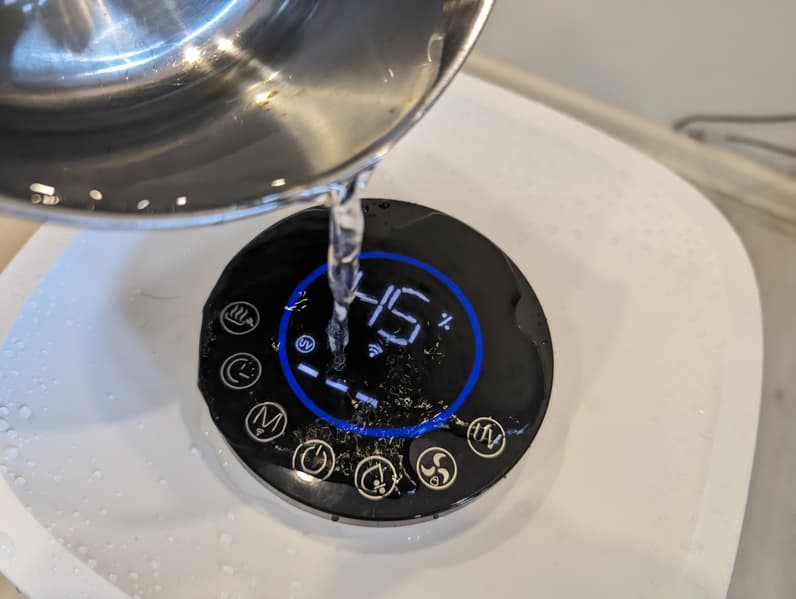 Климатическим комплексом можно управлять со смартфона, он защищен от случайного включения: есть блокировка, показывает текущий уровень влажности в помещении. Прибор работает в трех режимах — автоматическом по умолчанию, «Здоровье» — интенсивного увлажнения и ночном — с минимальным уровнем шума (и работы вентилятора, а значит и с минимальной производительностью) и с погасшими индикаторами.