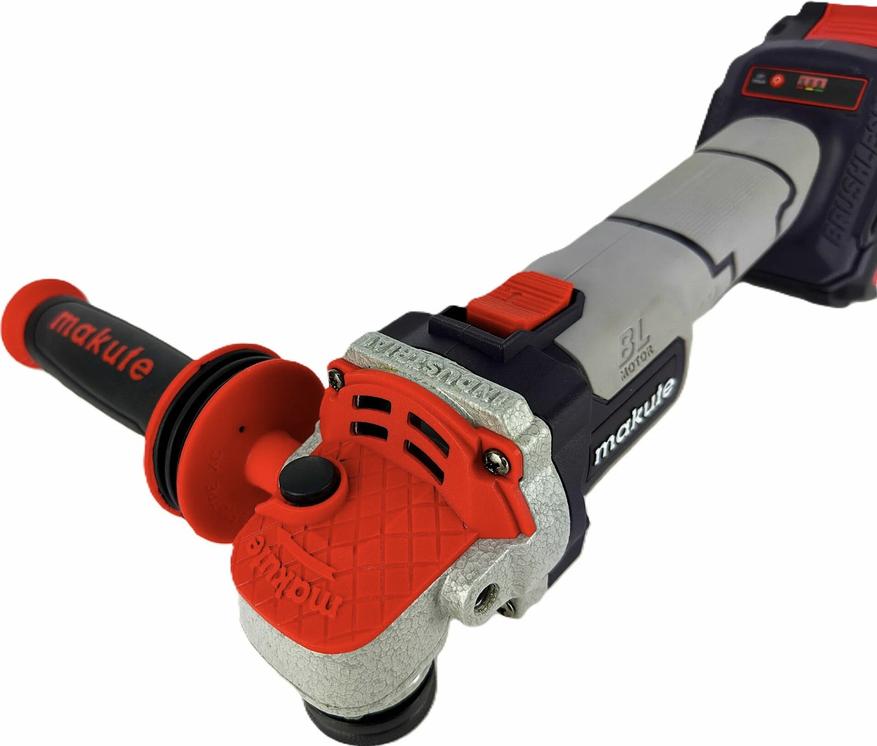 Продолжает список довольно оригинальная по внешнему виду угло-шлифовальная машинка от бренда Makute. Речь идет про CAG126-2BL — как видно из названия, данная версия оснащается бесколлекторным двигателем. Отмечу, прорезиненный корпус, включая защитную накладку на корпусе редуктора, а также возможность работы с дисками 11/125 мм.