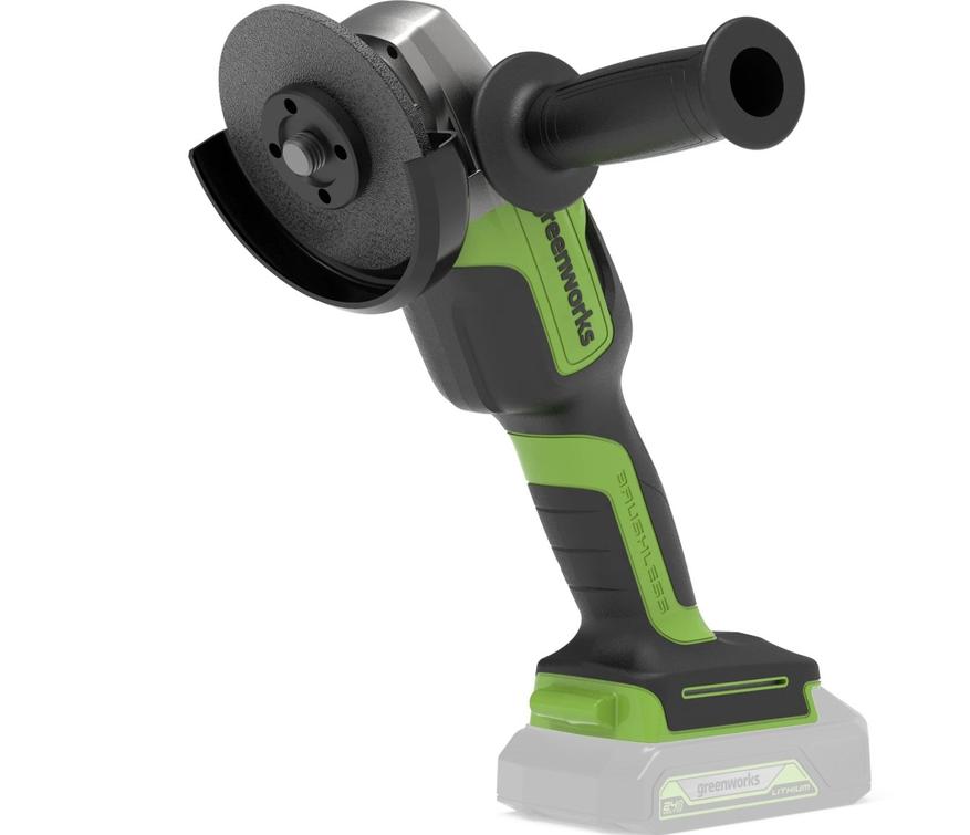 Еще один компактный вариант — это модель от Greenworks. Если судить из артикула GD24AGK4, то это УШМ с питанием от аккумуляторных батарей Greenworks 24 Вольта. По ссылке есть возможность выбрать не только вариант без аккумулятора, но и комплектацию с одним АКБ на 2.0 Ач (плюс сумка и сетевое зарядное устройство), или же с одним АКБ на 4.0 Ач (плюс сумка и сетевое зарядное устройство). В сборе с АКБ 2.0 Ач такая УШМ будет чуть легче по весу, но будет иметь меньшее время автономной работы с одной зарядки. Обзор на эту модель есть у меня в профиле.