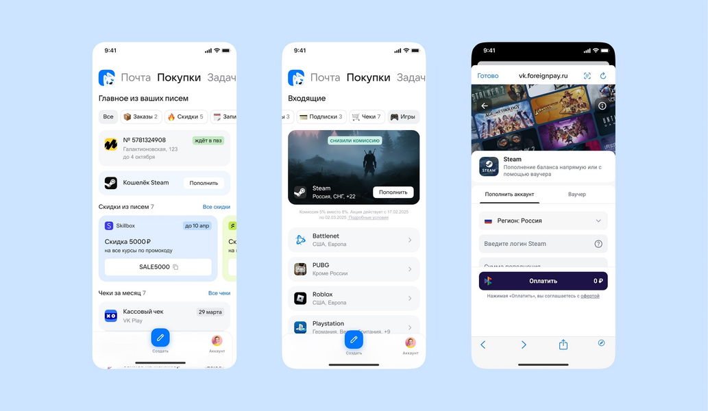 Компания VK (бывшая Mail.ru Group) объявила о запуске новой возможности в рамках своего фирменного почтового сервиса. Теперь пользователям «Почты Mail» стала доступна функция оплаты цифровых товаров Steam, Battle.net и других популярных платформ.