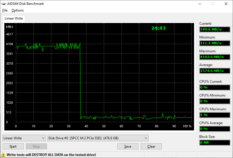В прыжке накопитель показал что-то, а районе 6000/4000 МБ/с для чтения и записи соответственно. После 165 ГБ на пустом накопителе скорость упала до, примерно 200 МБ/с, что вполне вписывается в бюджетное позиционирование накопителя, тот же NV2 показывает более скромные показатели, как в прыжке, так и на дистанции.