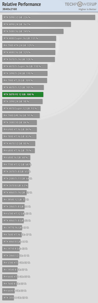 Если обратиться к обзору TechPowerUp, то новая карта быстрее RTX 4070 в зависимости от разрешения на 22-25%. Это лучше, чем у RTX 5080. Однако тут есть проблема. RTX 5080 сравнивали с RTX 4080 и RTX 4080 Super, так как обе эти карты максимально близки. В случае же RTX 5070, мы можем сравнивать с RTX 4070, а можем и с RTX 4070 Super, ведь если говорить о цене, то фактически новая модель сменяет именно RTX 4070 Super.