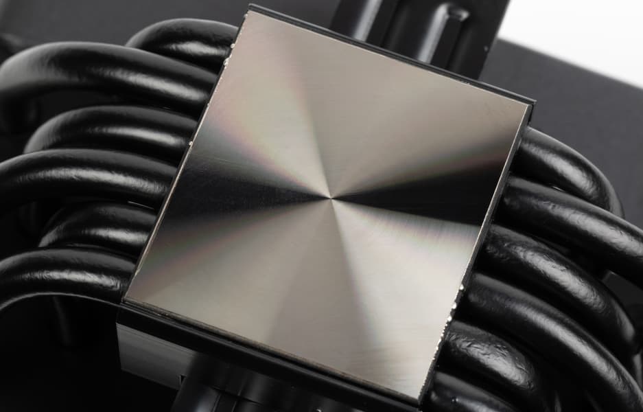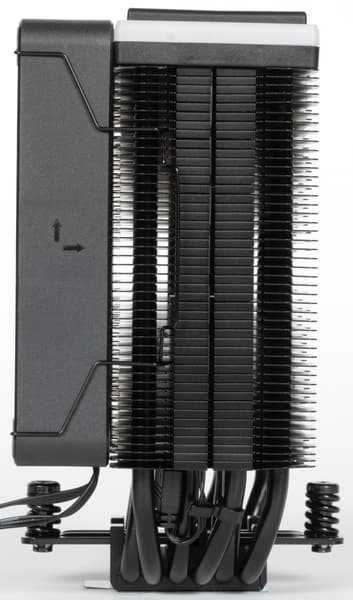 Кулер оснащен вынесенным радиатором, к которому тепло от процессора передается по шести тепловым трубкам. Трубки медные — на остальном тут сэкономили. Трубки, нерабочая поверхность теплосъемника и пластины радиатора имеют черное (в нашем случае) или белое (в соответствующей версии) полуматовое лакокрасочное покрытие. Верхняя часть теплосъемника изготовлена из алюминиевого сплава. Судя по виду, трубки просто запрессованы в теплосъемник, а не приварены к нему. Подошва теплосъемника хорошо отполирована. Ее поверхность (как обычно) немного выпуклая к центру с перепадом порядка 0,1 мм.