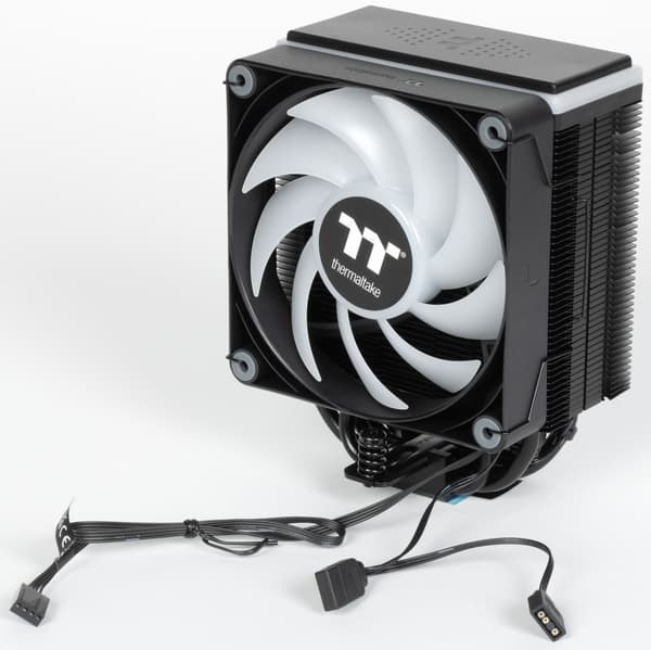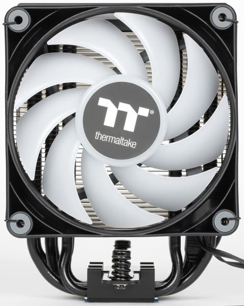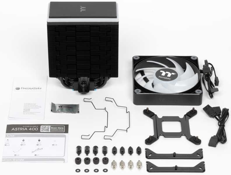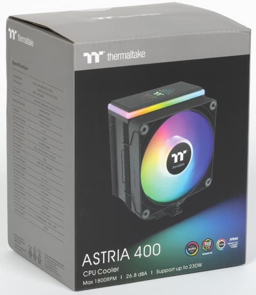 Неудивительно, что производители уделяют таковым немало внимания. Например, всем известный Thermaltake год назад на CES показал новые улучшенные вентиляторы CT120 ARGB и использующую их линейку процессорных охладителей Astria ARGB Sync, официально объявленную в конце весны прошлого года. В ней три модели (каждая в двух модификациях — черной и белой), закрывающие почти весь спектр запросов от среднего уровня и выше. Но Astria 600 — типичный двухбашенный двухвентиляторный (по умолчанию) «суперкулер» со всеми недостатками (и достоинствами) этого класса устройств. А Astria 200 выглядит слабовато для требовательного пользователя, поскольку снабжена всего четырьмя тепловыми трубками. Возможно, со временем мы и до них доберемся, но сегодня на повестке дня средняя модель Astria 400 — пожалуй, самая интересная. Средняя она, естественно, лишь в линейке Astria, а по рынку в целом ближе к топовому уровню, но всё еще компактная и относительно недорогая. Она официально подходит для процессоров с TDP до 230 Вт, это тоже средний показатель в линейке: Astria 200 ограничена 210 Вт, а Astria 600 способна рассеять до 260 Вт тепла, во что в штатном режиме уже укладываются и многие топовые процессоры. Однако, повторимся, габариты Astria 600 многих отпугнут, а средняя модель представляет собой компромисс между компактностью и эффективностью.