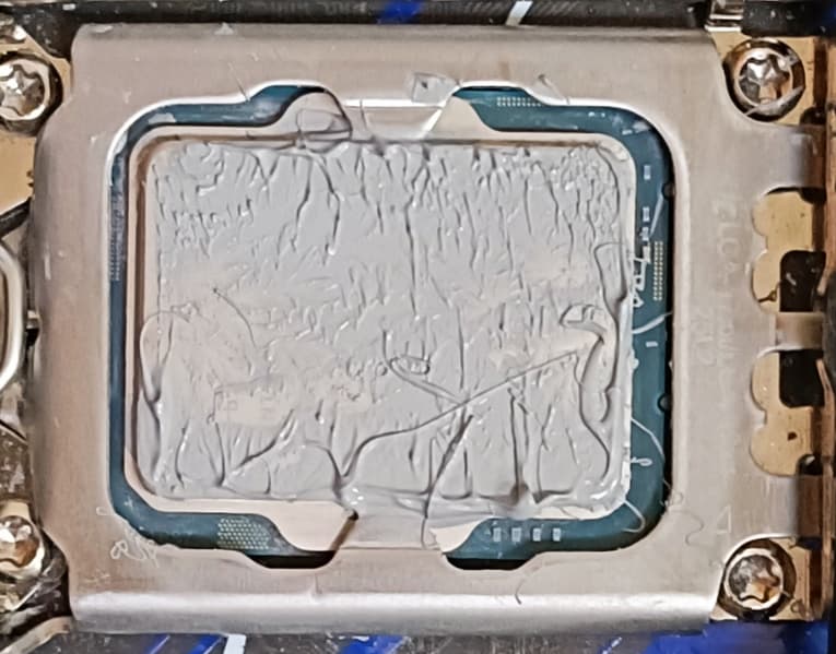 Преднанесенного термоинтерфейса нет, но производитель приложил к кулеру пакетик с термопастой в количествах на раз хватит и ладно. В тестах использовалась качественная термопаста другого производителя. Забегая вперед, продемонстрируем распределение термопасты после завершения тестов. На процессоре Intel Core i9-13900K: